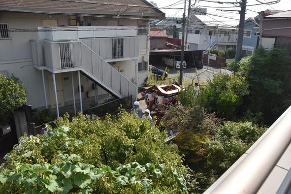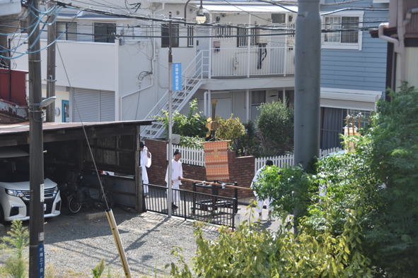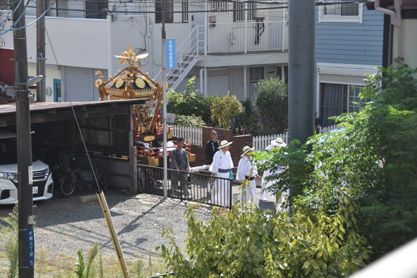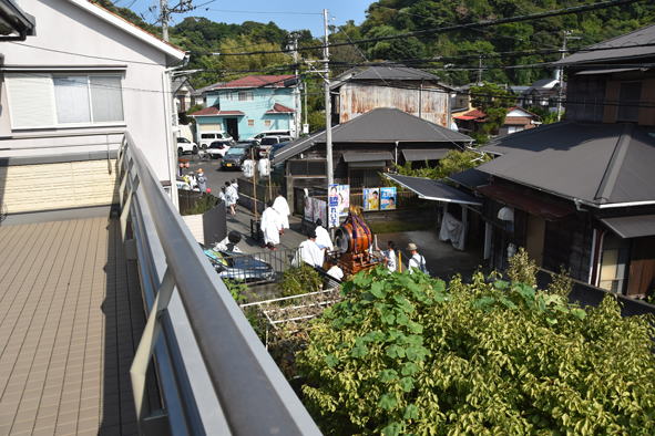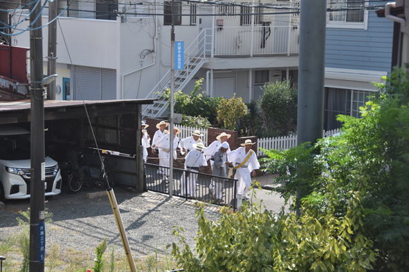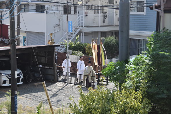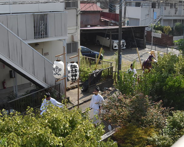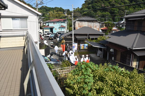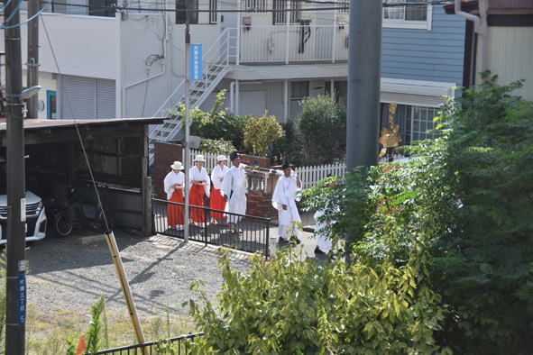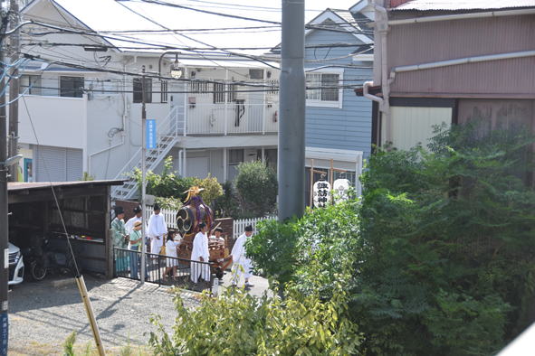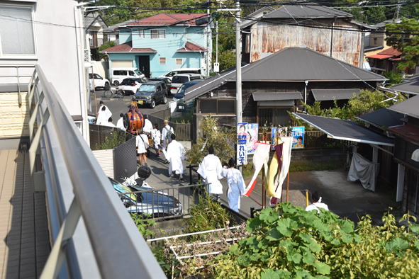 狭い道へは上の行列の一部が進みます。神主さんや御神輿は通りません。