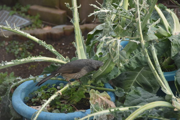 アカハラが時々来ている。枯葉などの下の虫でも探しているのだろう。ヒヨドリが色々な野菜の葉を食べるので困っているが、こちらはその心配はなさそうである。