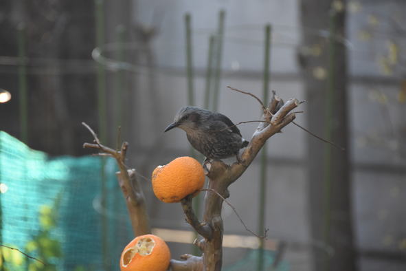 ハクビシンが食べ散らかした酢橘の皮をヒヨドリが食べています。