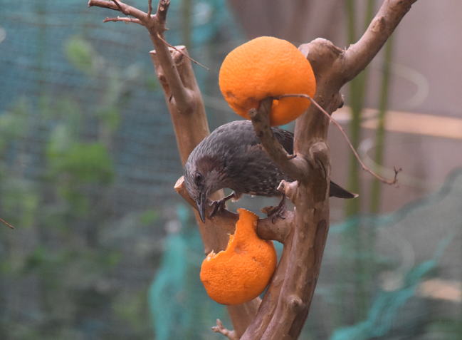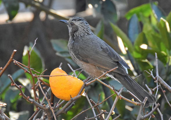 ヒヨドリが警戒しながら酢橘を食べています。自力で皮を剥くことは無理なようです。