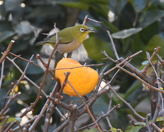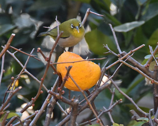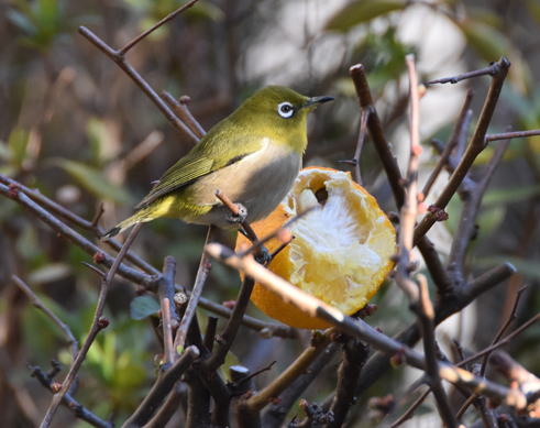 メジロが頻繁に梅の蜜を吸いにやって来ます。酢橘の皮が大分柔らかくなってヒヨドリが穴をあけて食べた酢橘の実からもメジロが汁を吸ったりしています。