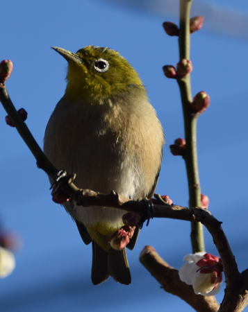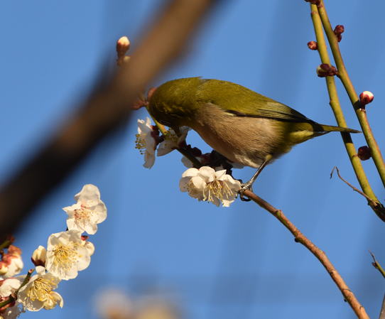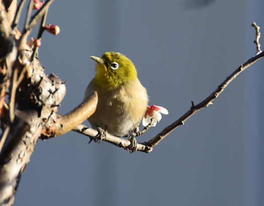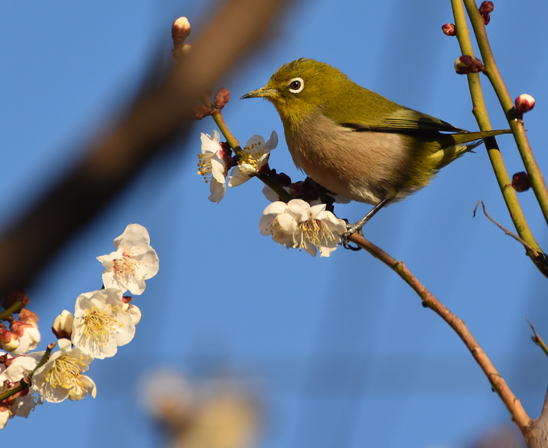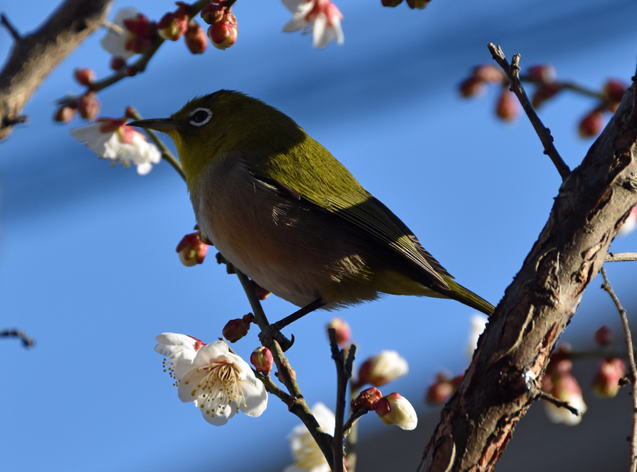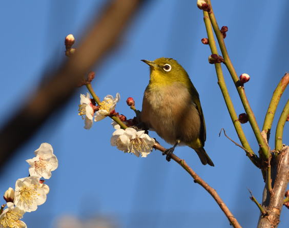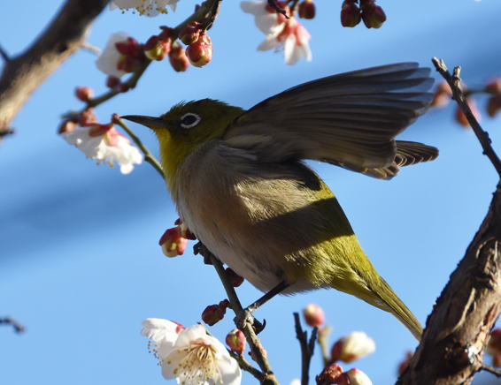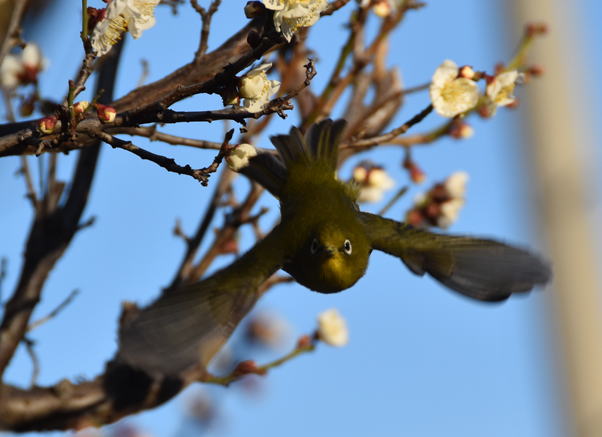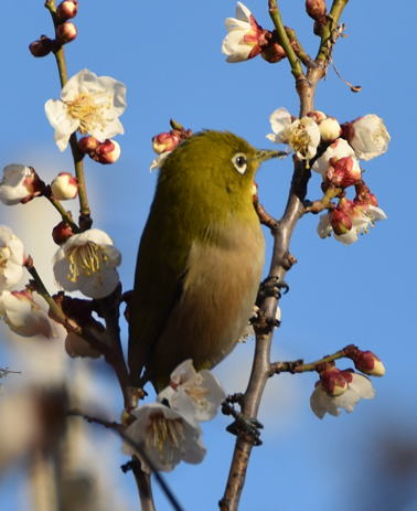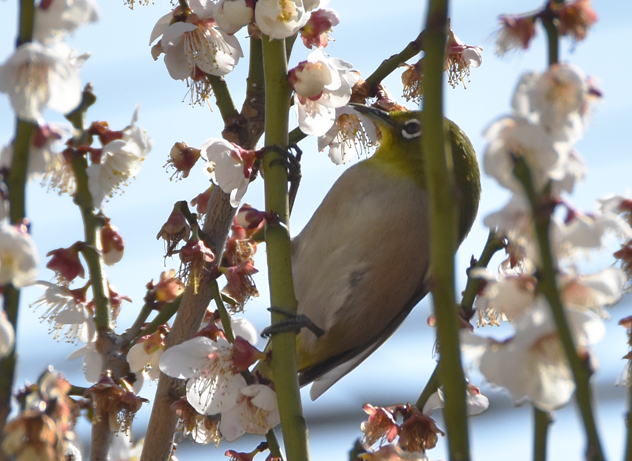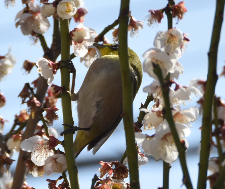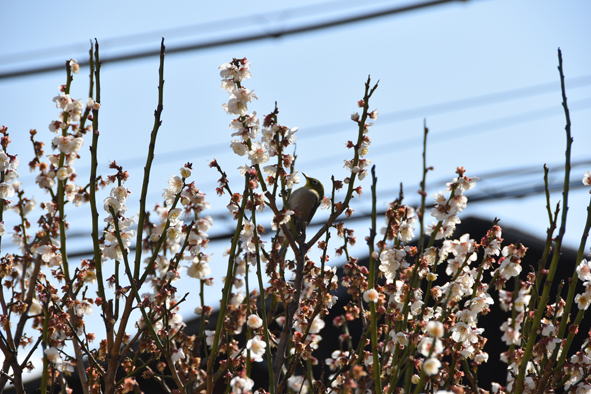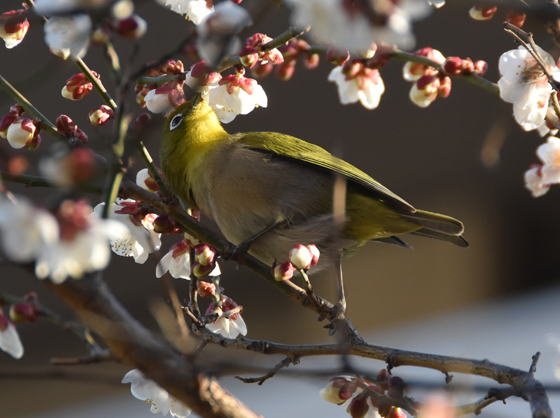 満開の梅の花にメジロが頻繁に来て蜜を吸っています。