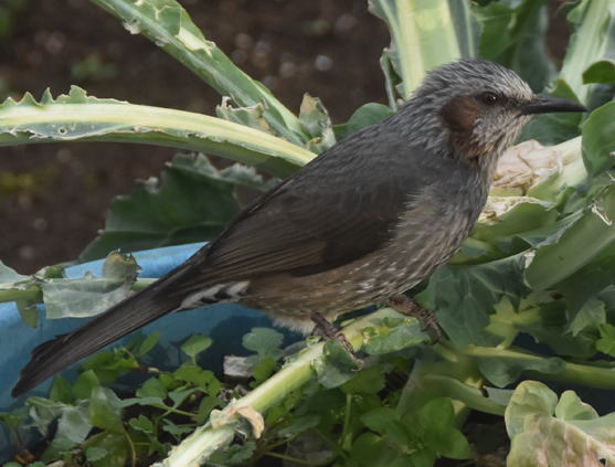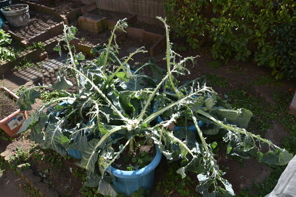 収穫後のカリフラワーの葉をヒヨドリが食べ、ほとんど茎だけになっています。この葉が無くなると次はサヤエンドウや蚕豆の葉などを狙ってきます。