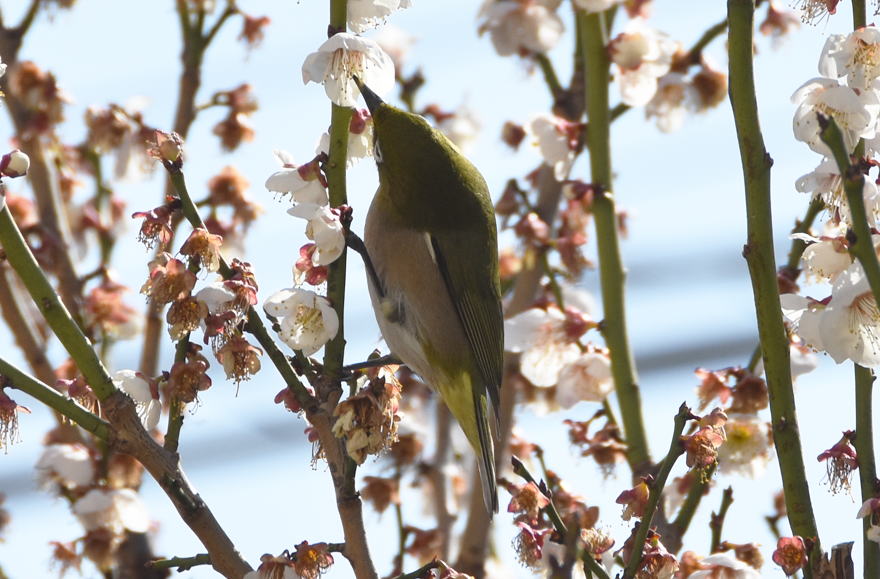そろそろ終わりに近づいた梅の花、メジロがひっきりなしに来ています。