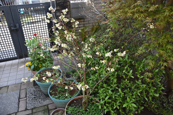 もう50年ほど前に戴いた牡丹、以前は咲いたこともあったのですが、最近は中々大きくなりません。ブルーベリー、大分花芽がついて咲き始めました。