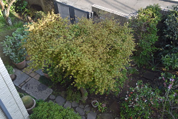 北東側、月桂樹が茂り過ぎたので切りつめる。桜も切りつめる。 北西側の桜は満開