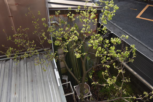枯れてしまった石楠花の後に植えたクリスマスローズや沈丁花 栗の木も芽吹いています。昨年は暑さの影響か、栗の実は全く採れませんでした。