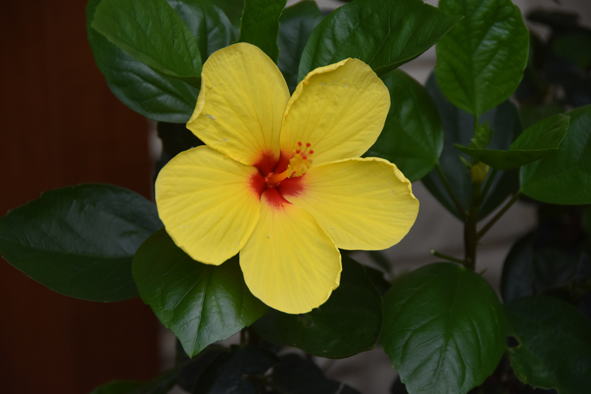 ハイビスカス、今年も咲きました。 5年程前、花束の中にあったもの、水中で根が出て、何回か切り戻して育っていましたが、先端部分の新芽の葉が割れるようになってきました。