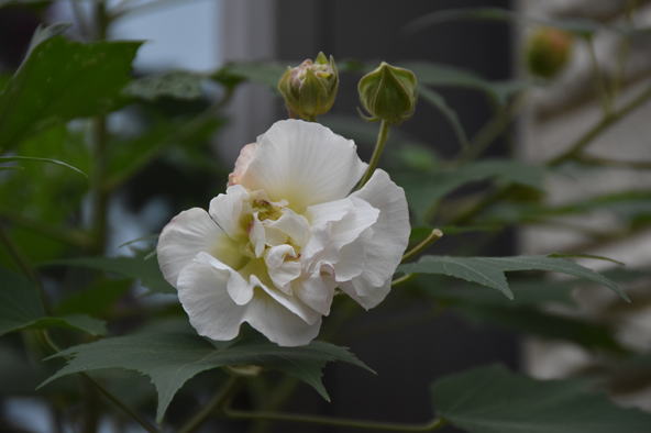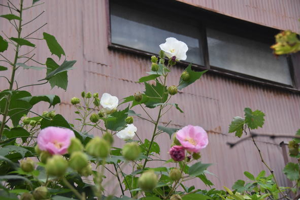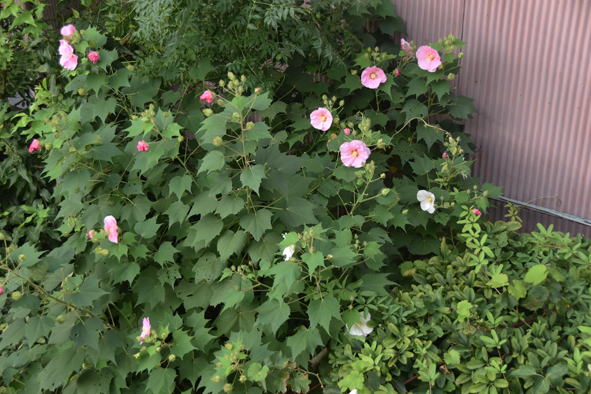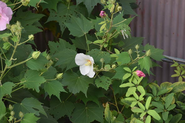 白い花は酔芙蓉、夕方になっても赤くなりません。手前は芙蓉、最初からピンクです。