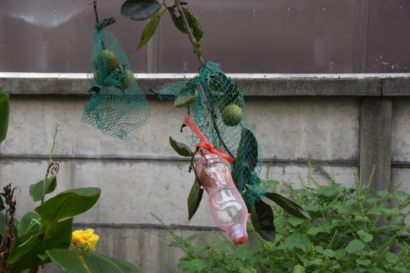 柿は鼠が食べに来るので、ネットを張ったり、ペットボトルで覆ったりです。