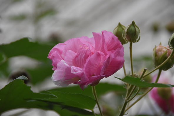 八重の酔芙蓉、前の日のものが残っています。 シャクナゲは夏の暑さで枯れてしまう。