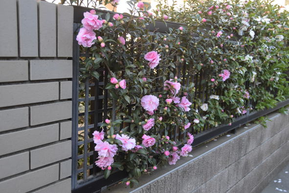 山茶花、白はほとんど終わり、ピンクが咲き始めている。