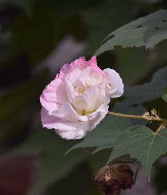 栴檀の枝切、栴檀の枝の生長は速く、毎年この程度まで刈り込みます。右の蝋梅、小さな蕾が見かけられます。次は酔芙蓉、芙蓉の刈り込みです。