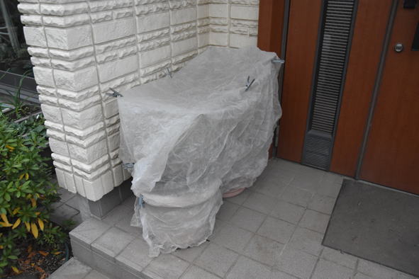 寒さに弱い鉢植えを室内に、金鯱に覆いを掛ける。