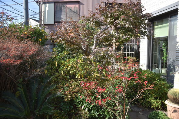 赤の山茶花はまだ蕾状態 ブルーベリーの紅葉、終了間近