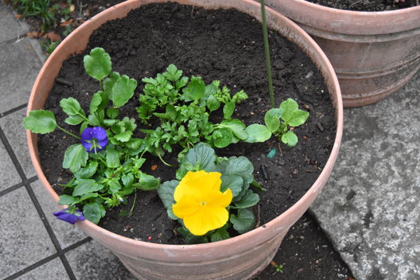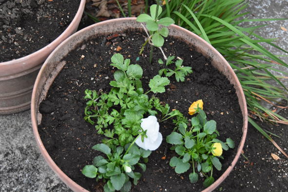 順調に育っているらしい挿し木で育てた無花果や巨峰の鉢とエンドウの鉢 中央の20年近く育っていた花水木は枯れてしまったようです。