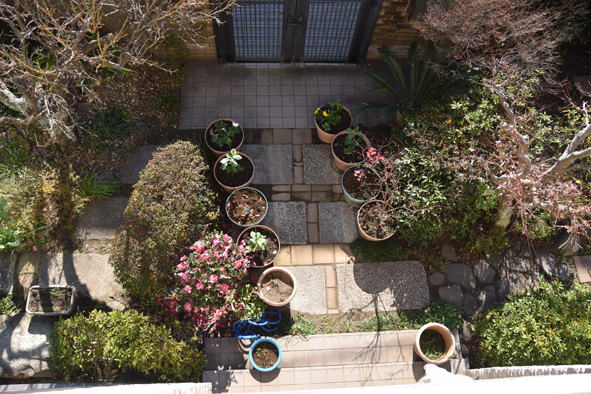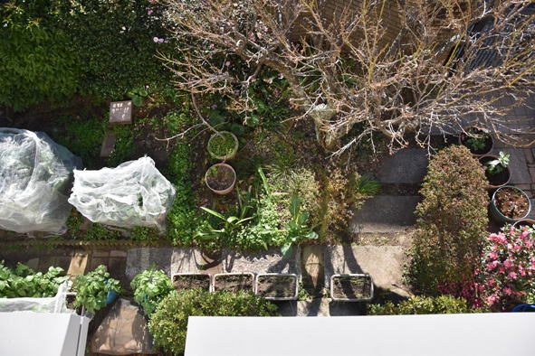 今年はソラマメ、沢山芽が出ました。15本、庭のあちこちに植えてあります。サヤエンドウ、そろそろ上にネットをかける必要があります。ヒヨドリの好物です。