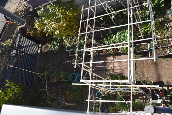 裏の庭で出た枯葉や野菜の残骸、抜き取った雑草などのゴミ置き場、片付けて腐葉土を篩にかけ、大鉢10数杯分の土がとれました。