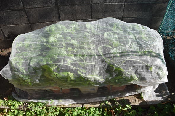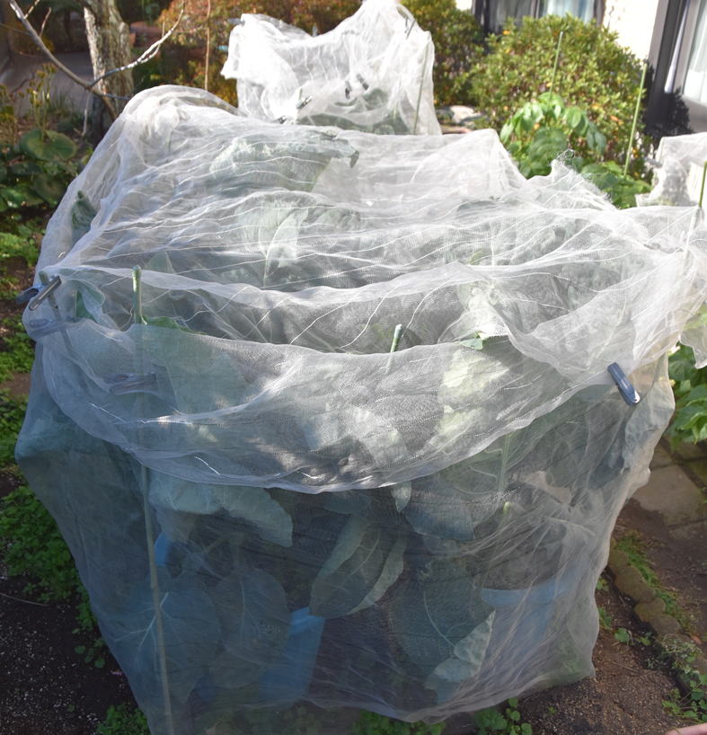 種から育てた芽キャベツ、種を蒔くのが遅すぎたようで、芽キャベツが出来そうにない。ヒヨドリが葉を食べるので、覆いをかける。