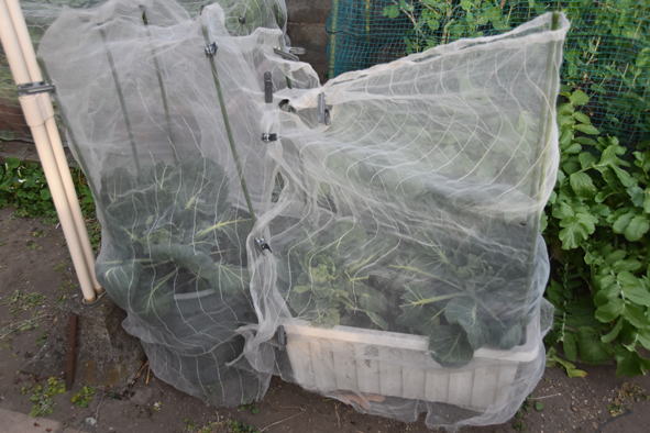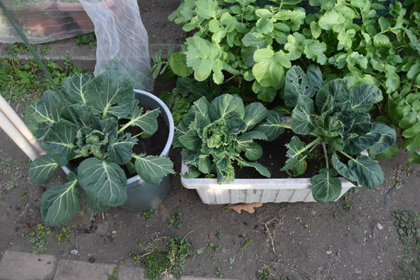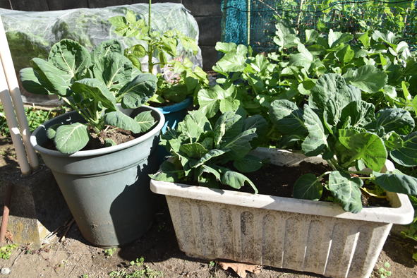 エシャロット、アスパラガス、芽キャベツなどの鉢 芽キャベツとカリフラワー、ヒヨドリ除けのネットの中