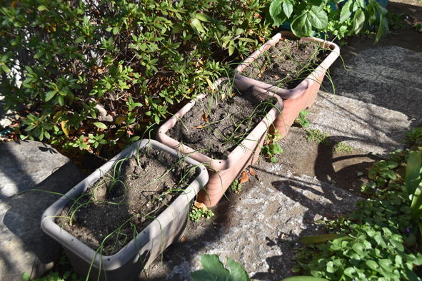 ここにも玉葱の鉢 余ったタマネギの苗の寄せ植え、小玉ねぎが出来ます。