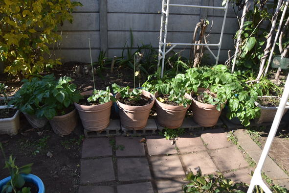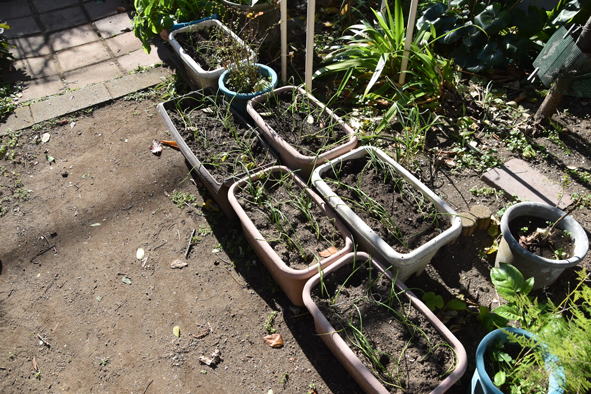 空豆の大鉢とジャガイモの鉢 玉葱の鉢、今年は玉葱の種を蒔くのが遅くなってしまい、育ちが悪い状況です。