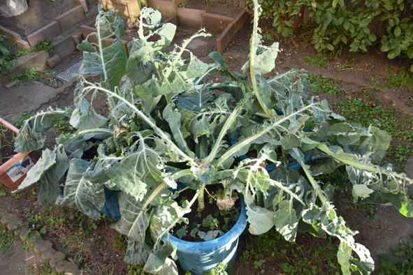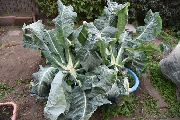 収穫終了のカリフラワー、ヒヨドリが頻繁に来て葉を食べています。