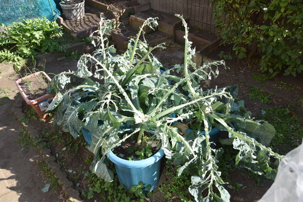 あちらこちらにあった小松菜は皆この通り、大根も大分食べられ、結実しなかった放置したミニ白菜もこの通り、ヒヨドリに食べられました。