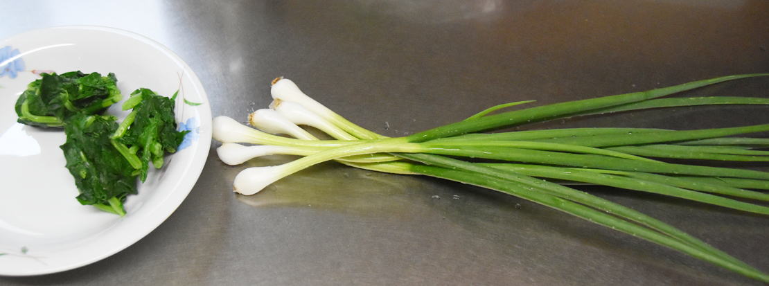 小松菜、サヤエンドウ、エシャロット、エシャロットはやや収穫が早過ぎた感じです。