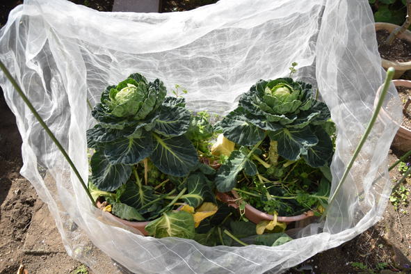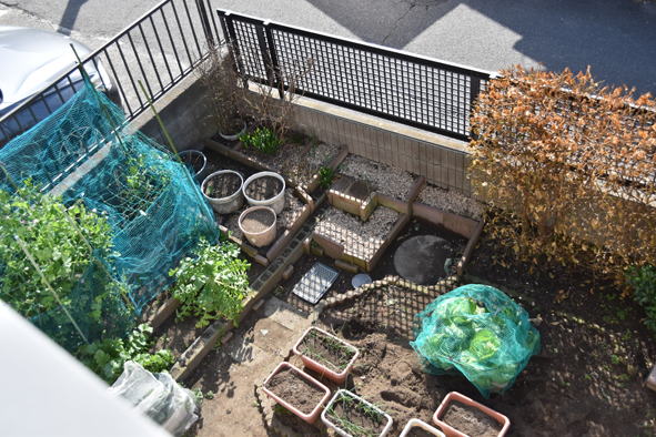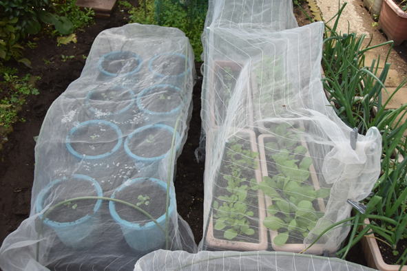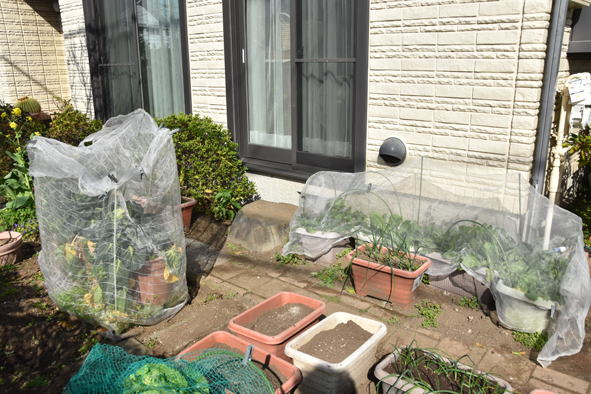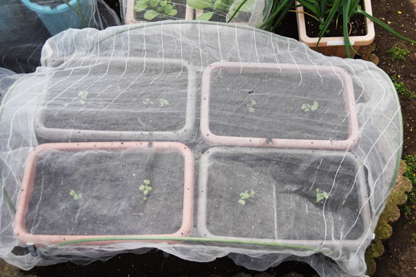 大根の芽が出たのでネットをかける。手前の鉢はキャベツ。 春菊も芽が出て来ました。