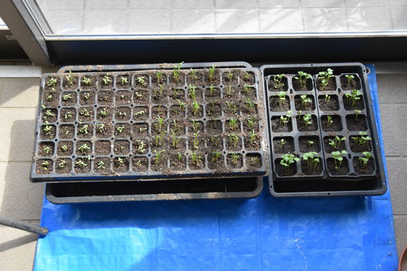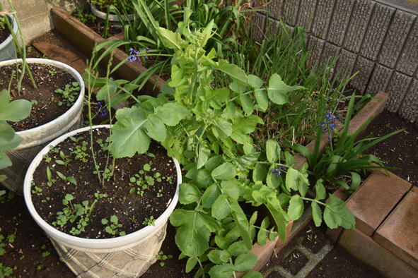 3月5日に撒いた春菊、ほうれん草、大根が芽を出しています。そろそろ植え付けです。 小松菜の花が咲いています。種が採れそうです