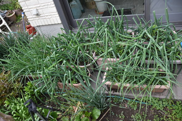 鉢植のニンニク、大部幹が太くなっています。余ったニンニクの苗を秋大根の間などに植えておいたものは幹がまだ細い状態。