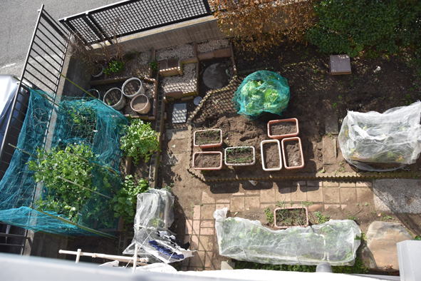 ジャガイモと自然薯の植え付け。 ヒヨドリ避けのネットを張ったサヤエンドウ、種から育った芽キャベツ、大根、右端の鉢はアスパラガス