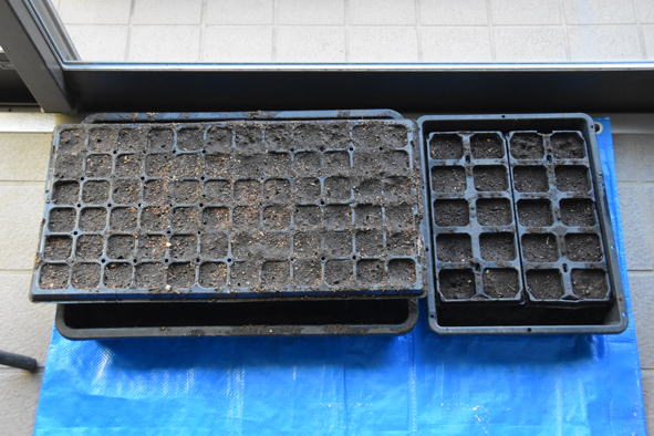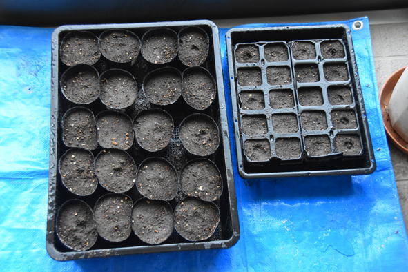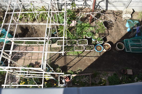 大根の種を蒔きました。手前はキャベツの鉢、奥はジャガイモやアスパラガス セロリー、二十日大根、レタスを蒔きました。