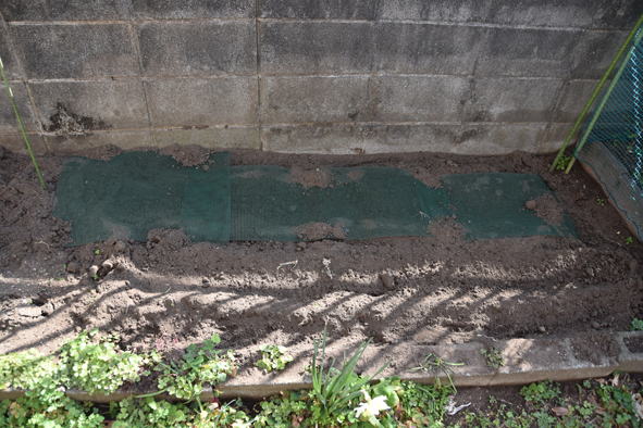 ジャガイモの植え付け、鼠などに荒らされないように防御の編みを置く。大根の種を蒔いたところにも網を置く。