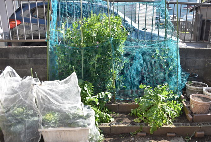 右、ネットの中は2月に蒔いたサヤエンドウ。その隣はアスパラガスが地中にあります。