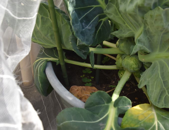 昨年採れた種から育った芽キャベツ、蒔くのが遅すぎたか、あまり大きくなっていないが、芽キャベツが出来ています。