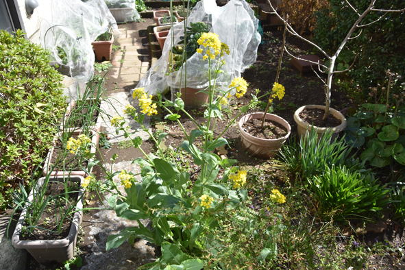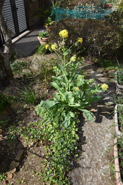 こちらの小松菜は花が咲いています。葉は2月頃にヒヨドリに大分食べられた痕が残っています。いずれも昨年の種がこぼれたものから芽を出したようです。