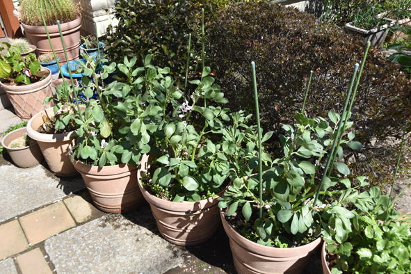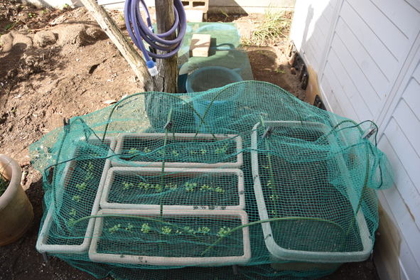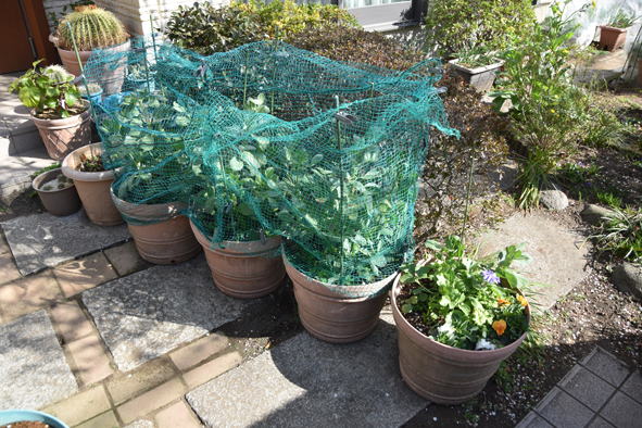 あちらこちらに置かれた蚕豆の鉢、ヒヨドリ避けのネットを張っています。