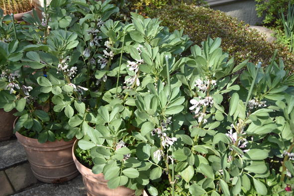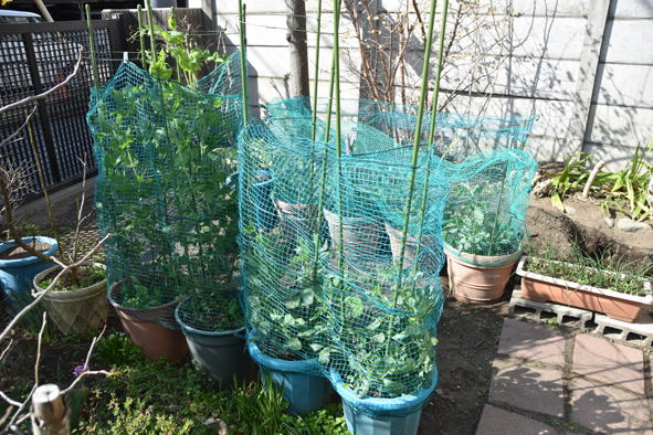 右の網の中は蚕豆、昨年は蚕豆の芽も食べられました。その右はアスパラガスの鉢