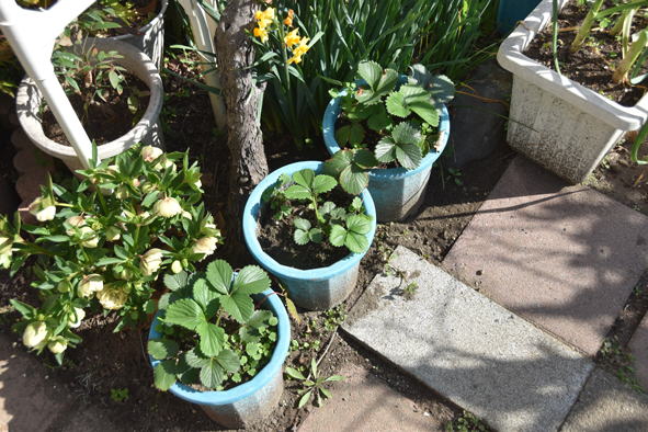 今年の苺は12月頃に小さな実ができてしまいました。食べてみたら甘みがありました。例年、これから株が大きく育つ時期です。脇にある鉢はニンニクの鉢ですが、勝手に生えてきた小松菜が大きくなって、その葉をヒヨドリが食べています。