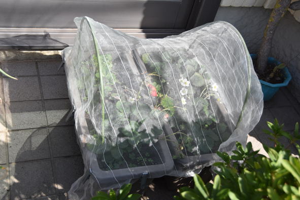 秋に蒔いたサヤエンドウ、採れ始めています。ヒヨドリに葉や新芽を食われるのでネットの中。 苺