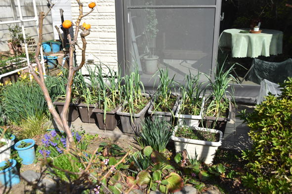 2023年3月1日(水) この時点で庭に植わっている野菜、狭い畑、地植えと鉢植えでフル回転、やりくりが大変です。
