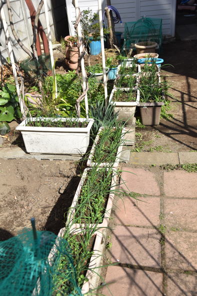ネットの中、葉をヒヨドリに大分食われましたが、大根はまだ採れています。手前はニンニク、玉ねぎ、エシャロット。