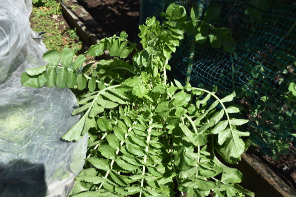 収穫し終わった芽キャベツ、ネットを取り払ったら、瞬くうちにヒヨドリが葉を食べてしまいました。勝手に育った小松菜、以前はヒヨドリが食べていましたが、キャベツなど方が好きなようでこのところ食べられていません。