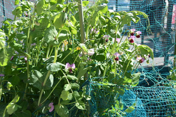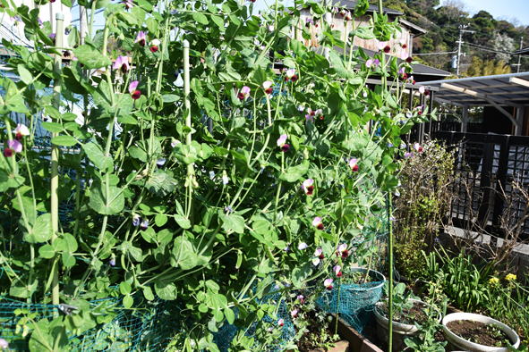 サヤエンドウ、花も大分咲き初め、背も伸びて来ました。ヒヨドリ除けのネットも粗いものに変えました。