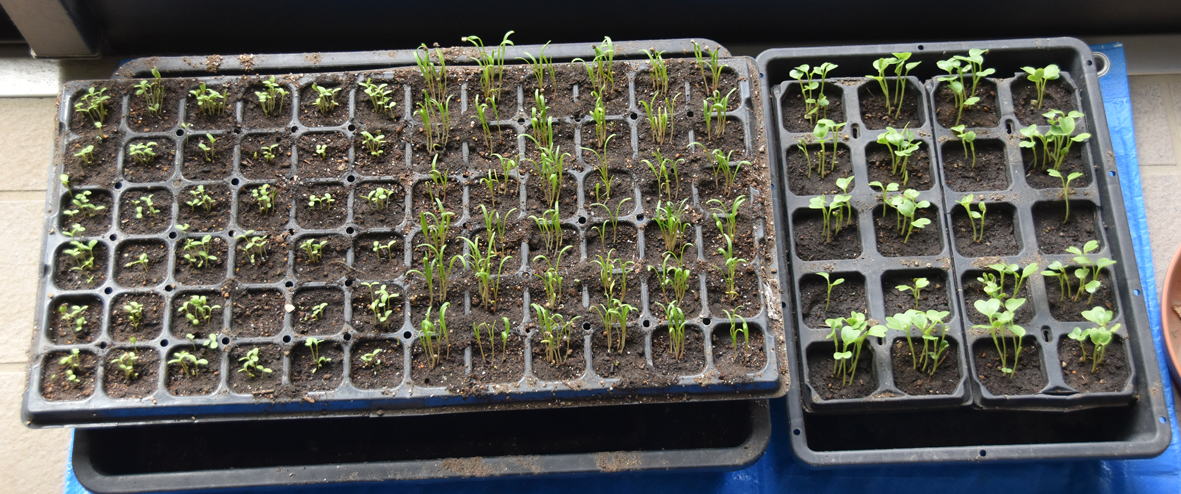 3月5日に蒔いた春菊、ほうれん草、大根、発芽して双葉が出ているので、植え付ける。