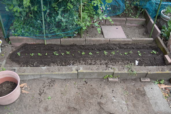 発芽した大根、虫よけ網をかける。 レタス、チンゲン菜とレタスの種蒔き