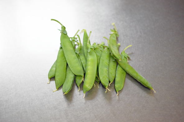 サヤエンドウ、ひとつかみほど最初に花が咲いたものを収穫。最盛期はまだ大分先です。