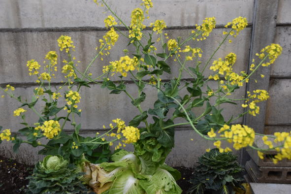 こちらは苗を買って育てた芽キャベツ、ほとんど収穫は終了しました。 玉葱 小松菜の花